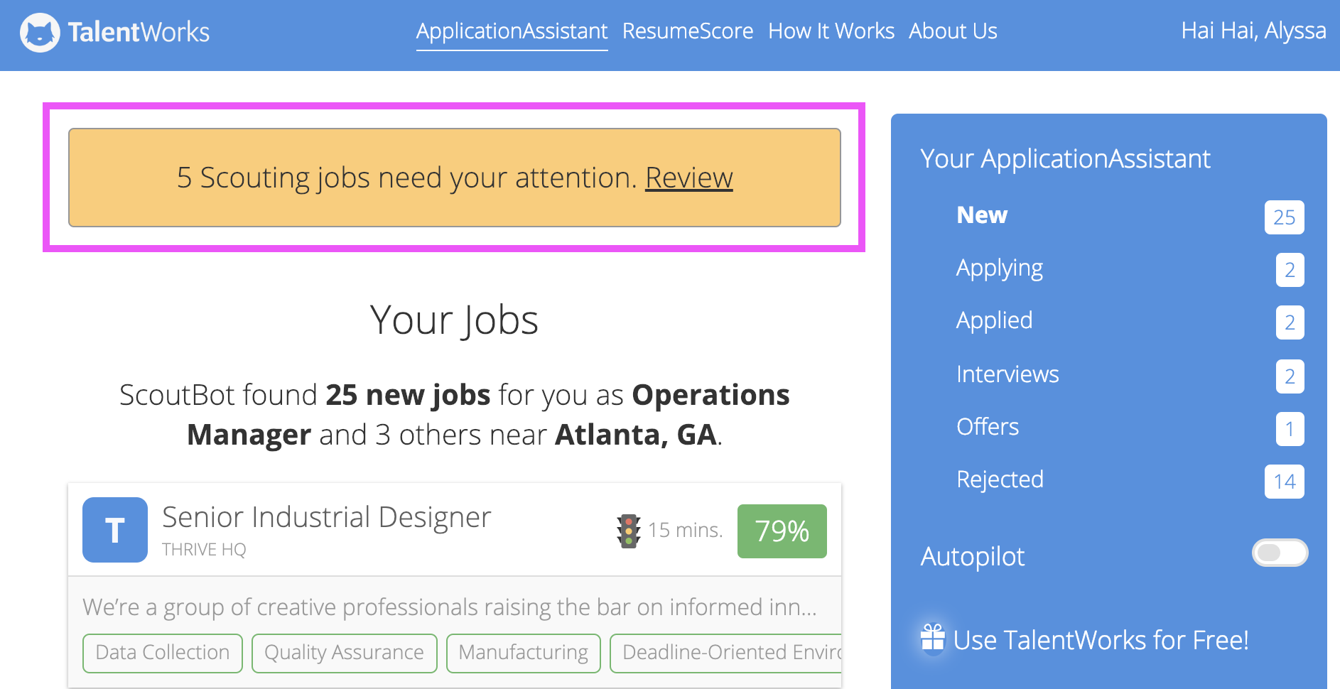 Good question! This timeline can vary based on many factors, but is mostly dependent on the complexity of the specific application. Once you click "Apply Now," or after 24 hours if you have AutoPilot on, you're telling the AppBot to begin the application on your behalf. Sometimes the application is instantaneous (e.g. all it needs to do is submit your resume) and it'll move to Applied pretty quickly. Other times, it moves into Applying because it's a more complex application but rest assured it is working to get that application in on your behalf. Make sure to take note of any application questions that are required complete an application — you'll see a message like the one below if there are any blocking questions: